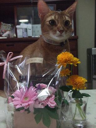 飼い主、めでたく〇3歳の誕生日を迎えることが出来ましたが、近所のお友達がお祝いにとお花をプレゼントしてくれて大感激! で、記念にし写真を撮ろうとしたら・・・