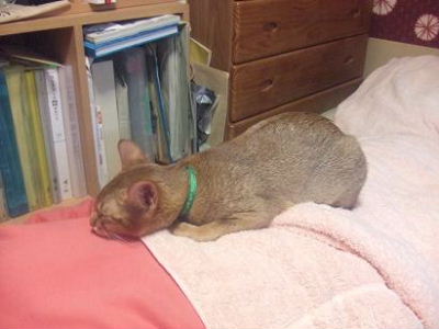 いきなり飼い主のお腹の上で寝るという大技を見せてくれました。今迄、一度もこんな事はしなかったので、飼い主、びっくりです。(20時からの絶食を言い渡されていたので、もしかしたらフテ寝かも)