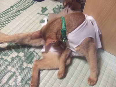 何だか動きづらそうで可哀想だ、と、Mioがおとんの古いシャツをバラして即席の術後服を作り、着せてみたのですが・・・(背中が凄い事になっています)