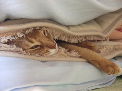 今週、睦月が姿を消して、いくら呼んでも、餌をガサガサさせても現れず、焦った焦った!そしたら、おとんが「最近、布団の間でよく寝てるぞ!」と、一言。で、慌てて見たらこんな事になってました。