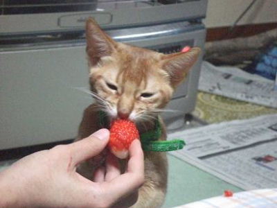 目をつぶっておいしそうに食べてます。慌てて飼い主が止めましたが、苺を喜んで食べる猫って一体・・・。