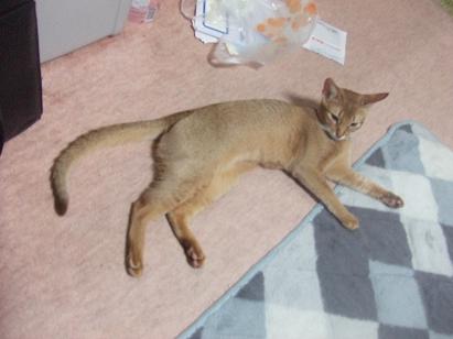 暑さに参った飼い主が扇風機を出したら、一番先に扇風機の側を陣取ります。(ソコは涼しくないっちゅうの!)