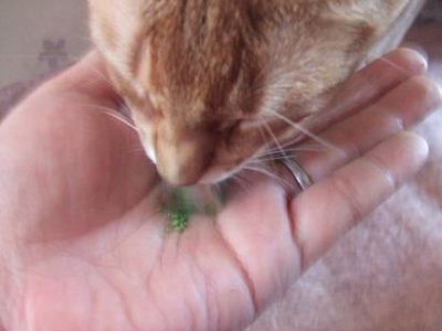 例に依ってお嬢様、作っている飼い主の傍に来てねだります。当然、ネコは舐めないだろうと冗談で差し出したら・・・