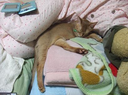 お嬢ちゃん、普段は絶対にくっついて寝ないくせに、移動して沈没。 あれっ?この格好と表情