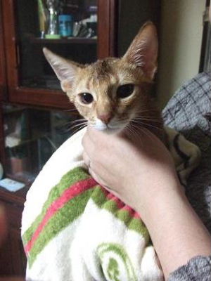 飼い主にバスタオルで拭かれてますが、目、怒ってる?(私が洗ったんじゃないからね~!)