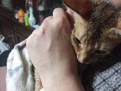 濡れた手足を一生懸命舐めて、少し落着いた頃、Mioがお風呂の掃除に行ったのですが、睦月、一緒にくっついてお風呂場へ。(お風呂場が大好き!)で、突然Mioに洗われてしまい・・・。(バカだね、お風呂場についてくからだよ)