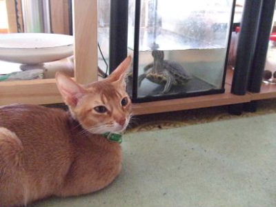 ネコ(アビシニアン)、スナネズミ、魚(タナゴ、モツギョ、金魚)、亀(ミドリガメx2)