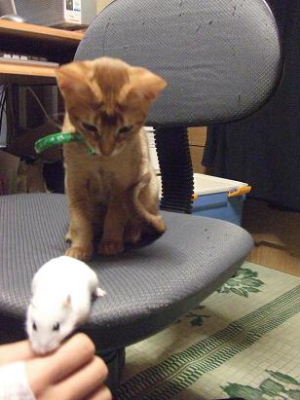 ネコ(アビシニアン)、スナネズミ、魚(タナゴ、モツギョ、金魚)、亀(ミドリガメx2)