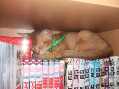で、甘えて満足して、最近得意の本棚での野良寝を決め込む睦月さんです。