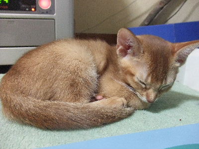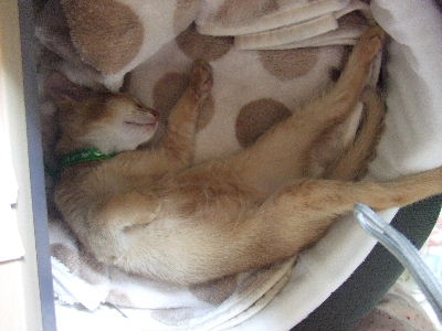 お迎え当日、夜の睦月。緊張の糸が切れたのか、ちんまり丸くなって熟睡です。(げっ、この頃から野良寝の予兆があったんだぁ!)