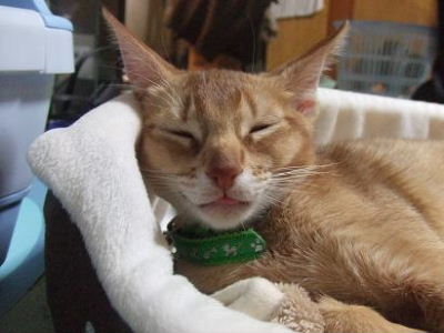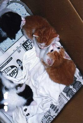 「直ぐ連れて来て」と返事をして、慌ててあり合わせのベッドを作って待っていると、小さなダンボールの箱にへその緒が取れたばかりの子が4匹居ました。その内1匹はもう鳴く力もなく、小さく口を開けているだけで他の子の世話をしながら2時間程抱いて、何とか蘇生。それからは戦争でした。3時間毎のミルク、ティッシュでお尻を刺激しての母猫代わりの排泄、結膜炎の投薬、離乳食とトイレトレーニング等、子育てより大変でした。