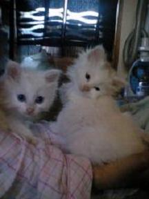 去年の春の事です。Mioさんが友人が飼えなくなった子猫を2週間位預かる事になったと、突然キャリーバックを持ち帰りました。開けてびっくり玉手箱!中からはウン〇まみれになった白い長毛種の子が2匹も出て来たのです。