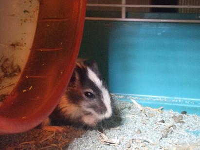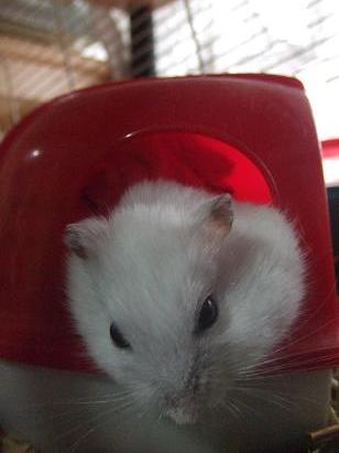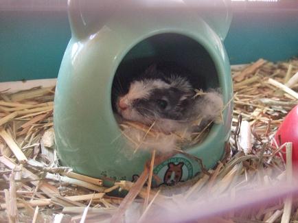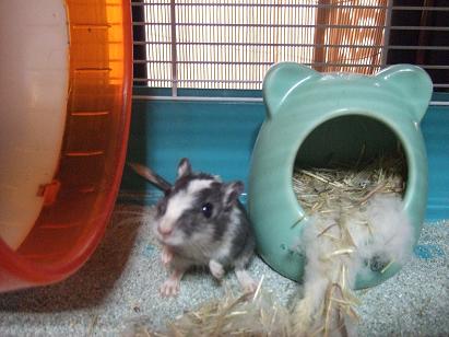 で、考えた上にカラカラの陰でおもむろにもぐもぐするのですが、なんせハムと違って動きが素早い!写真を撮るのに一苦労で、その上、掃除をしても掃除をしてもカゴの中がすぐに汚れてしまいます。牧草を入れてみたり、巣材も色々試してみたのですが、やはり砂が一番良いみたいでした。(目元、笑っているように見えませんか?)
