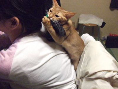 飼い主、急いで家路についた頃、Mioの髪に飛び掛ってました。最近、朝は7時半過ぎ、夜は7時帰宅の飼い主。朝もあまり長い時間抱っこしたり、撫でてやったりとゆっくりスキンシップをとってやれないせいか、やさぐれ気味です。