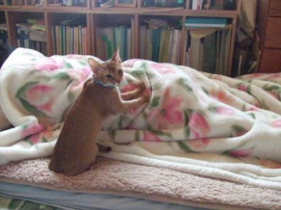 さっき起きてきたたまごと、今、飼い主の布団に先回りしている睦月です。二匹して何をかんがえてるのかな?
