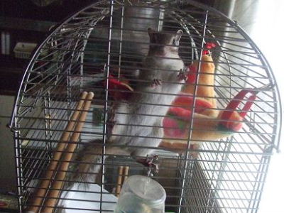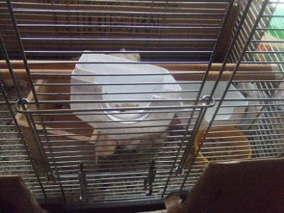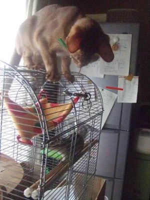今回、余程気になったのか、檻の上に上がってしまいました。クーは嫌な顔してましたが(笑)